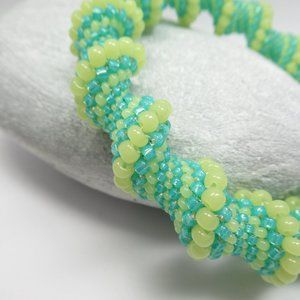 This listing is for the handwoven Cellini spiral bangle pictured. It was handwoven one bead at a time using alternating silver lined light turquoise or shiny Tiffany blue colored beads and Uranium glass seed beads that react under blacklight due to the Uranium used in coloring the beads. It glows very bright.