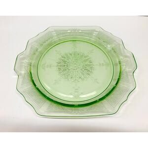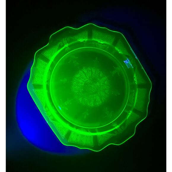 Offered is a stunning Depression Era green uranium glass sandwich plate or platter in the elegant Princess pattern, dating to the 1930s. This octagon shaped piece measures 10” x 11” and features intricate etched designs with a radiant translucent green hue that glows under UV light, a hallmark of uranium glass.