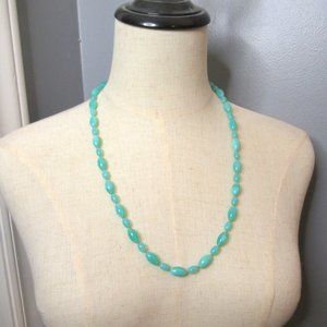 This listing is for the teal green colored Uranium glass bead necklace pictured. It is new, never worn and made from vintage stock beads. It was hand knotted (by me) using durable Jade green colored Griffin Nylon cord. It is 25 inches of continuous beads. It goes over the head and lays nicely on the bust. It has 52 beautiful milky teal color beads that alternate between larger and smaller beads. The beads glow under blacklight due to the Uranium used in making the glass. It was hand knotted with love.