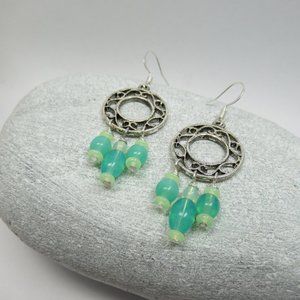 This listing is for the pair of Uranium glass dangle bead earrings pictured. These earring are in good new condition. They were crafted by me using silver tone components and Sterling plated nickel free earwires. The beads in these earrings glow under blacklight due to the Uranium used in making the beads. They are one of a kind. They have a dreamcatcher feel to them, though that was not my initial intent.