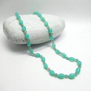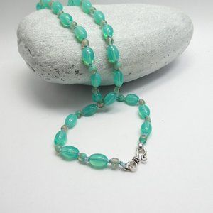 This listing is for the Uranium glass bead necklace pictured. It is new, never worn and made from Czech glass round mixed beads and vintage teal ovals. It was hand knotted (by me) using durable Griffin Nylon cord. It is 18.5 inches and finished with a small Bali style Sterling silver hook clasp. It has 61 beautiful beads. The beads glow under blacklight due to the Uranium used in making the glass. It was hand knotted with love.