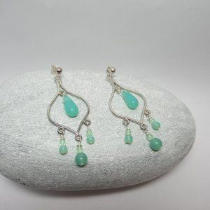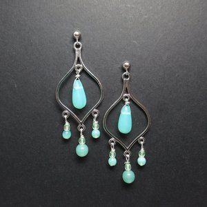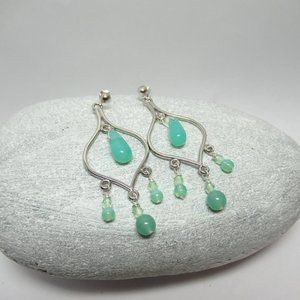 This listing is for the pair of uranium glass bead chandelier style earrings pictured. They are new and have never been worn. They were made by me using silvertone components and a combo of greenish and teal Uranium glass beads. The earrings hang on 925 Sterling Silver 4mm ball posts. The beads glow under blacklight due to the Uranium used in making the glass.