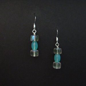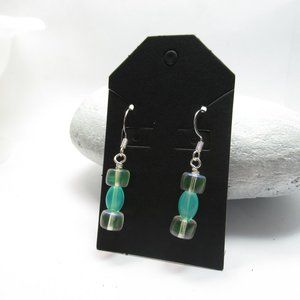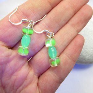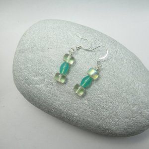 This listing is for the pair of Uranium glass vintage bead earrings pictured. The glass beads glow under blacklight due to the Uranium used to make them. They were made by me using silver plated and nickel free findings and earwires. They are new and have never been worn. The rondelle beads on this pair are vintage light pink with an AB coating and a center UV glow. The center beads are teal, with a bright glow.