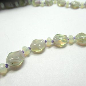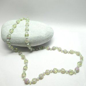 This listing is for the creme, yellow and light lavender Uranium glass bead necklace pictured. It is new, never worn and made from vintage stock beads. It was hand knotted (by me) using durable lavender colored Griffin Nylon cord. It is 25.5 inches of continuous beads. It goes over the head and lays nicely on the bust. It has 92 alternating faceted and swirled beads. The beads glow under blacklight due to the Uranium used in making the glass. It was hand knotted between each bead with love.