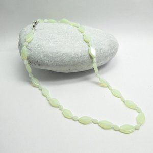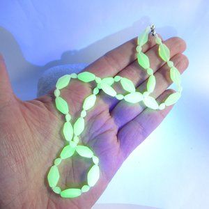 This listing is for the light yellow Uranium glass bead necklace pictured. It is new, never worn and made from Czech glass pinch beads and vintage Czech big diamonds. It was hand knotted (by me) using durable Griffin Nylon cord. It is 18.25 inches and finished with a small Bali style Sterling silver hook clasp. It has 45 beautiful milky beads. The beads glow under blacklight due to the Uranium used in making the glass. It was hand knotted with love.