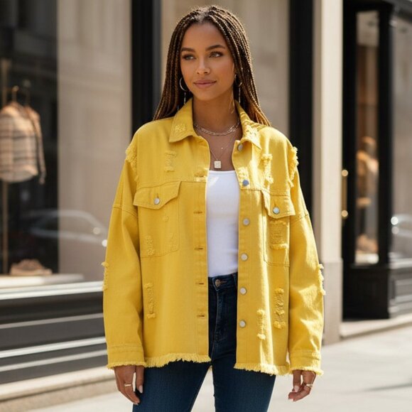 Yellow denim distressed jacket, distressed denim jacket, yellow jean jacket, trendy yellow jacket, fashionable denim jacket, women's distressed jacket, yellow ripped jacket, stylish yellow denim, edgy fashion jacket, yellow denim outerwear, yellow denim fashion, distressed yellow jean jacket, unique denim jacket, yellow street style jacket, distressed yellow jacket, yellow denim, casual yellow denim jacket, yellow denim for women,