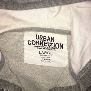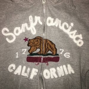 San Francisco, CA classic with the state bear. Color is a heater gray. Size is large but runs small. Classic sweatshirt material.