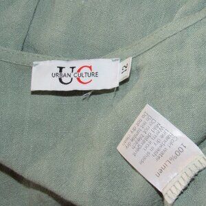 Urban Culture 100% Linen Green Open Cardigan Maxi Duster Jacket Women's sz 12. No belt. Side pockets. Banded cuffs.
