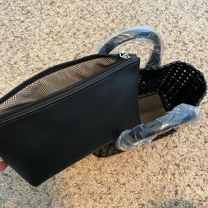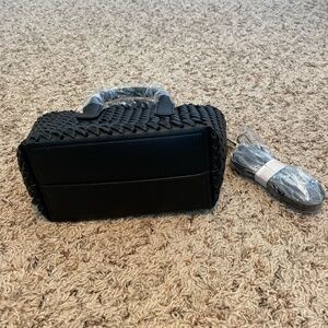 Sleek black woven design with double top handles (still wrapped) and a detachable/adjustable crossbody strap.