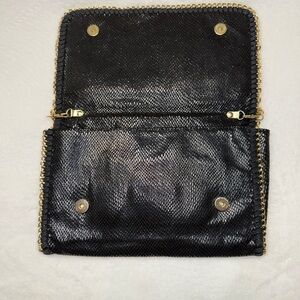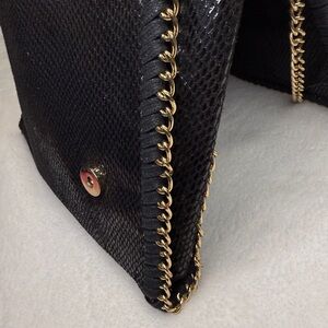 Elevate your style with this chic black clutch featuring elegant chain trim. Perfect for any occasion, this bag adds a touch of sophistication to your ensemble. Very little wear in excellent condition