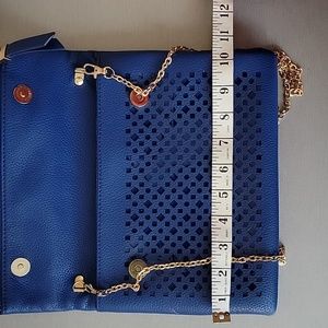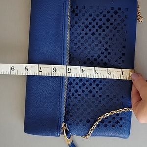 Elevate your handbag collection with this stylish piece made from lux vegan leather and features a beautiful woven front panel design. It is both fashionable and sustainable. It has a front slip compartment and a fold-over shape, features a snap front flap that keeps your belongings safe and secure and a detachable gold chain strap, making it perfect for any occasion. The inside is lined with polka dot fabric. It has 1 slip pocket and 1 large zip compartment and one zip small pocket providing ample storage for your essentials. Magnetic clasps provide security.
