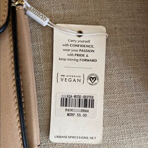 This elegant crossbody bag from Urban Expressions features a sophisticated envelope-style design in a versatile tan color. The bag is crafted with a smooth, high-quality material and includes a removable, adjustable strap for added convenience. Its gold-tone metal accent adds a touch of luxury, making it perfect for both casual and formal occasions. PETA approved vegan