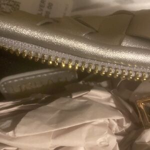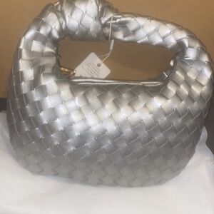 Urban Expressions Tracy Woven Clutch silver new with tags. Urban Expressions The sliver Tracy Bag is perfect for a fashionista who loves a sophisticated flair. This stylish piece features a woven all-over exterior with gold hardware. The zipper closure allows you to easily access your items while you're on the go. The interior boasts fabric lining and a secure zipper pocket knot detail, woven design 11in W x 11in H