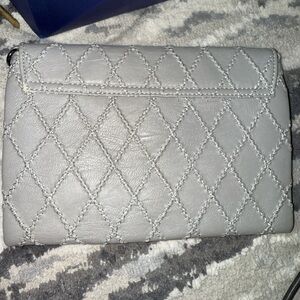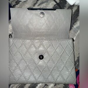 Versatile, trendy grey leather clutch with a woven diamond pattern and silver trim on the fold over flap that snaps