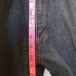 Urban Label Men's Denim Blue Jeans Red Stitching Straight Leg 36 Waist Zip Closure. Jeans are pre-owned. Please see all photos for visible condition. Decorative embroidered back pockets. 75% cotton 25% polyester. RN# 138278. Rise 10.5 inches, inseam approximately 28.5-29 inches.