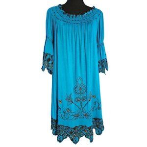 Urban Mango Deep Ocean Blue Comfy Boho Dressy Beaded Lounge Mini Dress, Size M