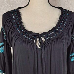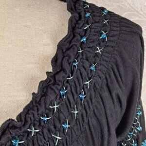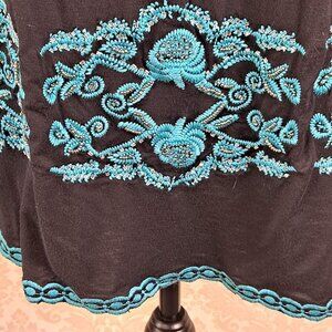 This black dress is anything but boring. Features turquoise embroidery that has metallic accents as well as beaded accents. Smocking around the neckline with a tie at the center. The short bell shaped sleeves have the same detailing as the rest of the dress. A fun piece to dress up or down.