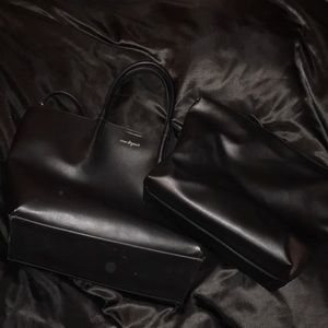 Vegan leather, 2 piece bag. Includes strap that can connect to outside or inside layer. Inside layer has 3 pockets, 1 with a zipper 2 without. Outside layer can be carried as a tote or crossbody. Inside layer can be carried as a large clutch or cross body. New without tags.