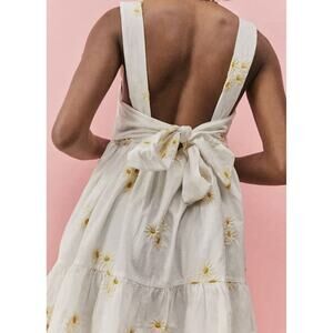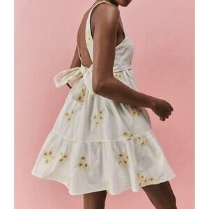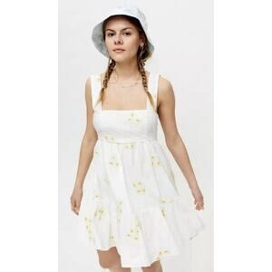 Get ready to embrace the bohemian vibe with this stunning Urban Outfiters dress. The square neckline and strappy sleeves add a touch of sophistication to this A-line sundress, while the tie closure and empire waist give it a touch of vintage charm. The dress features a beautiful floral pattern in white and yellow, making it perfect for any occasion, be it a casual outing, a party, a cocktail event, or even travel.