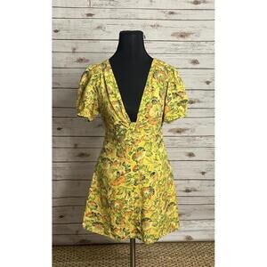 Yellow/ multicolored floral pattern; plunging V-neck; w/ twist front detail; short sleeves; empire waist; non-functioning 7-button front placket; slight A-line/tea dress silhouette; skirt lined; floaty mini hem