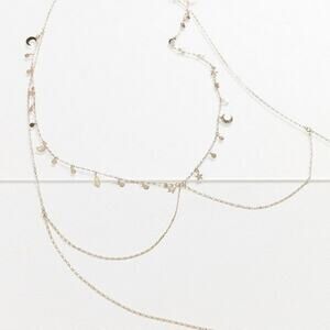 DESCRIPTION This cosmic bra-shaped body chain Featuring delicate, spindly chains wrapping around neck + back with celestial-themed charm accents scattered throughout. Finished with lobster clasp closures + extender chains.
