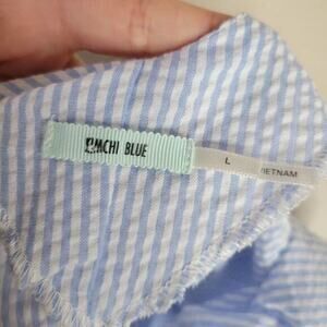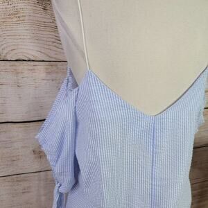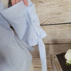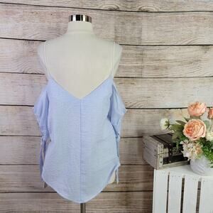 Urban Outfitter Kimchi Blue Cold-Shoulder Tie-Sleeve Top Size Large. Minimalist meets femme in this cold-shoulder top by Kimchi Blue. Lightweight striped knit in a relaxed-fit, A-line silhouette. Topped with a v-neckline + thin spaghetti straps. Topped with cold-shoulder 1/2 -length sleeves with tie cuffs. Finished with a V-back. 65% Polyester; 35% Cotton.