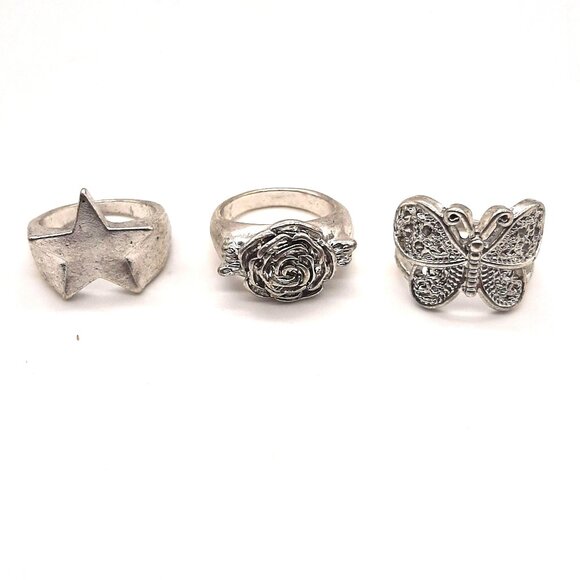 Urban Outfitters 3 Silver Tone Rings Star Rose Butterfly sz 7 Y2K layers whimsy