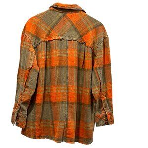 This distressed plaid flannel shirt features a slouchy fit, long sleeves with cuffs, a button-front, a front patch pocket, raw seams, and hem. New with tags, excellent condition, size small, orange and khaki plaid
