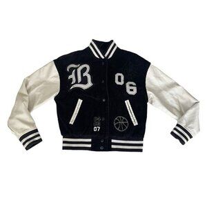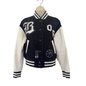 BDG for Urban Outfitters woman's cream ribbed knit sweater.  Jacket is black corduroy with white faux leather sleeves.  I has black and white banded cuffs and hem and has an embroidered "B"  patch and embroidered "OG" and basketball on the front and a large white stitched spiderweb on the back.  It's made of 100% cotton and is fully lined.  Jacket is a woman's size XS. Org. list price $149.