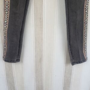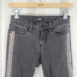 Very good condition, has faint grease stain (see photos), mid rise cigarette ankle jeans. Embroidered detailing, charcoal gray color, skinny jeans. BDG by Urban Outfitters brand, size 25 waist 27 length.