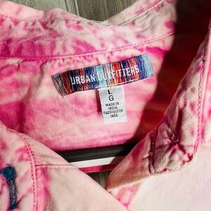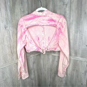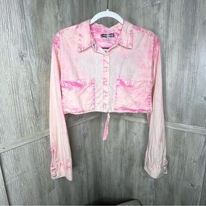 Pink Distressed Wash Long Sleeve Button Front Blouse. Cut Out Back with Buckle Strap. Raw Edge Hem.