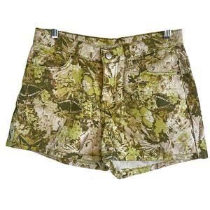 Urban Outfitters BDG Denim Shorts - Dipped v waistband, yellow/green botanical print with butterflies, low rise style, 5 pockets, button/zip closure.