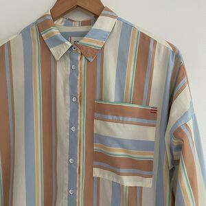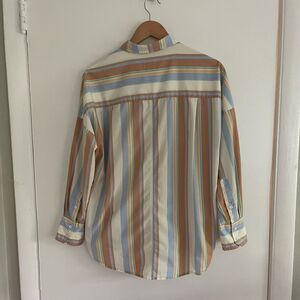 The Frankie Spliced Button-Down Shirt by BDG for Urban Outfitters in Yellow Multi. A wardrobe staple button-down shirt. Oversized fit, complete with a pointed collar and a button placket at the front. Pockets. Gently worn with no flaws. Measurements in photos.