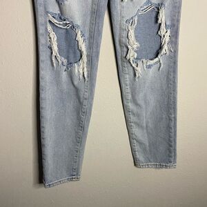 High Rise Mom Jean from BDG. Light wash. Ripped and distressed. Size 24. 12” rise. 30” inseam. Gently preowned condition with no stains or pilling.