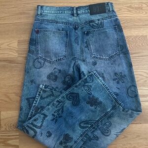 Super cute & hard to find BDG Cowboy Jean Urban Outfitters Jeans! New without tags. Dark Blue prints of butterflies, peace signs, flowers, UFOs, etc; and Grey embroidered panda bear, flowers, etc. Some areas have Pink or Green tint. Size 29.