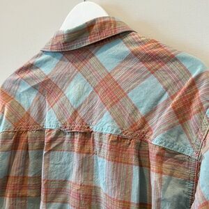 BDG Urban Outfitters Plaid Cropped Button-Down Shirt. Color: Blue/Orange. Boxy cropped fit with peated accents in the front. Finished with pointed collar, flap pockets at the chest and button cuffs. Distressing bleached look.