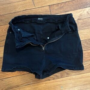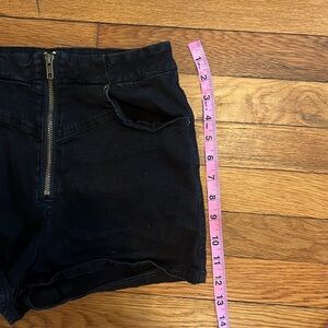 Super high rise black denim short shorts. Zip front and two pockets in back. GUC with some fading. Material is stretchy.
