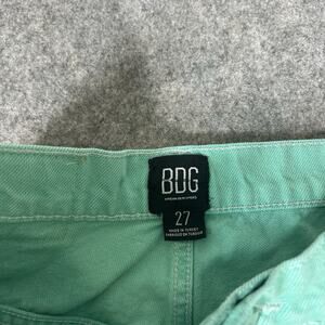 The product is a pair of Urban Outfitters BDG women's cargo pants in a size 27 with a relaxed fit and straight leg style. The pants are in a solid green color with a high rise and made of cotton material. They feature a zip closure, pockets for accents, and are machine washable. The pants are suitable for all seasons and are perfect for a casual yet stylish look.