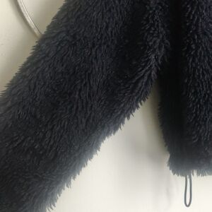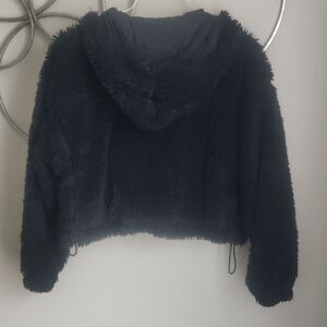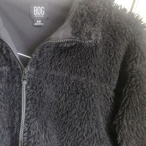 This BDG hooded, black fuzzy jacket boasts a thick, textured knit providing both warmth and style. Purchased at Urban Outfitters retail $79. Size S.