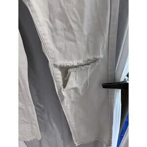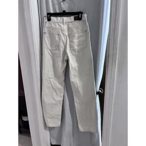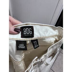 Elevate your bohemian style with these Urban Outfitters Bdg High Ride Mom Jeans in Ecru/Ivory Distressed Jeans. The jeans feature contrast brown stitching, zip and button closure, and a high-rise waist of 28 inches. The 100% cotton denim fabric ensures breathability and comfort, making them perfect for all-day wear.