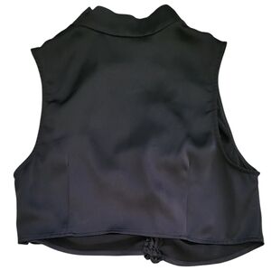 Elegant black satin sleeveless top with a stylish ruched & bow design. Perfect for any occasion. Mock Neck. Button Detailing. side zipper. Cropped silhouette. Perfect for going out, date night, clubbing.