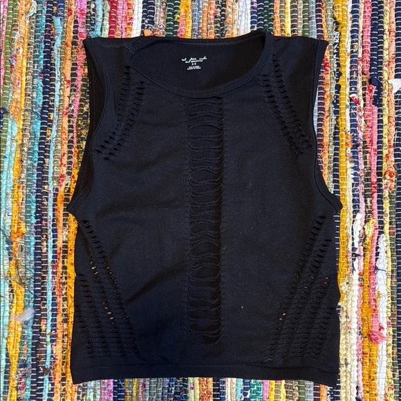 Chic and edgy black sleeveless top with stylish cut-out details. Perfect for a bold, modern look.