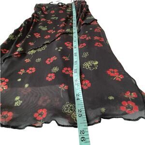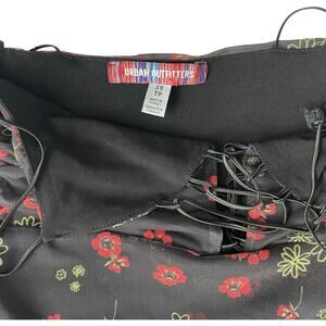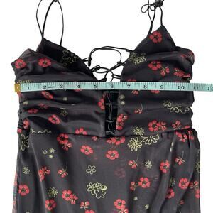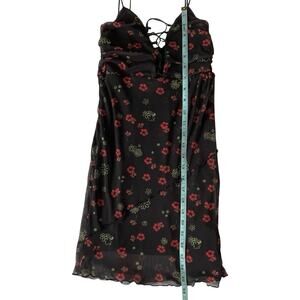 Y2K-inspired black floral slip dress from Urban Outfitters, featuring a red and olive green flower print with a semi-sheer overlay. The design includes a lace-up corset-style front, adjustable spaghetti straps, and a soft asymmetric mesh hemline, above the knees. An effortlessly flirty and vintage look.