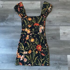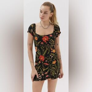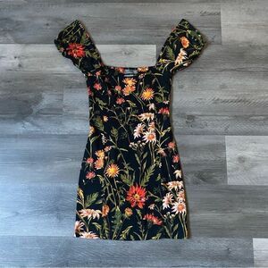 Urbane Outfitters dark floral Bodycon dress. Black with bold bright colorful flowers gives a dark feminine vibe. Square neckline, Bodycon fit. Size XS with stretch. Please see photo section for approximate flat measurements. Material: 91% viscose, 6% nylon, 3% elastane. Note: flower print placement varies from model photos.