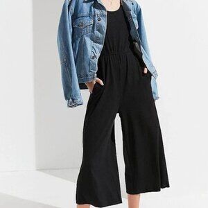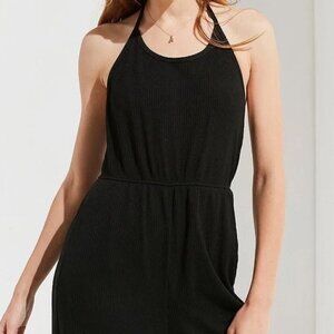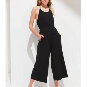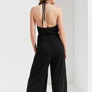 Chic black halter jumpsuit. Features wide-leg design. Perfect for any occasion.