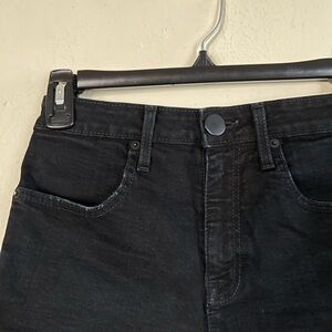 All measurements are taken flat and are approximate. Super high rise pin up shorts from Urban Outfitters. Black denim, only a little stretch at the waistband but pretty true to size.