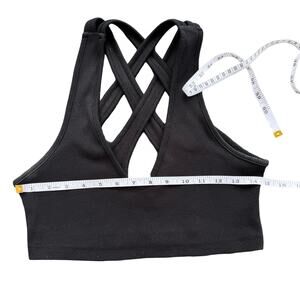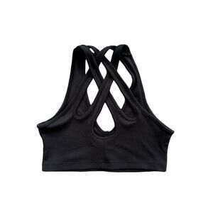 Urban Outfitters black ribbed crop tank top in size medium. Features a unique crisscross strappy back design and soft, stretchy ribbed fabric for a flattering fit.