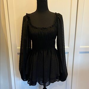 Chic black romper with sheer sleeves. Smocked waist for a flattering fit. Perfect for day or night. Built-in skorts.