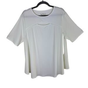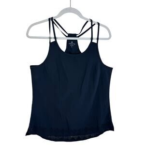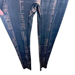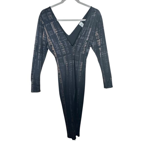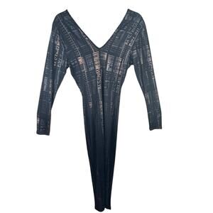 Excellent preowned condition. Black & rose gold metallic bodycon long sleeve double V-Neck lightweight stretchy bodysuit. Polyester/spandex material. Approx. measurements: Total length 60", inseam 30", Sleeve from neck to sleeve hem 29". Size M.