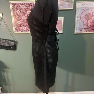Chic black dress with textured fabric. Features lace-up design for a modern look.